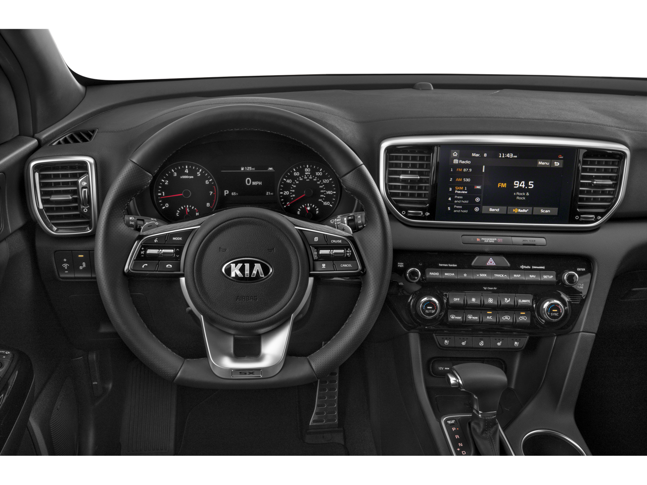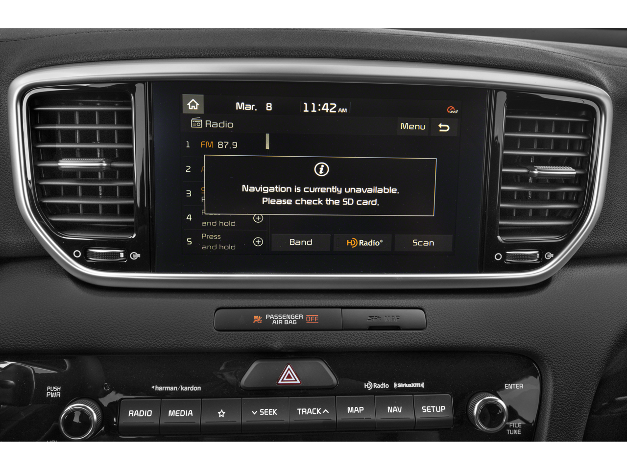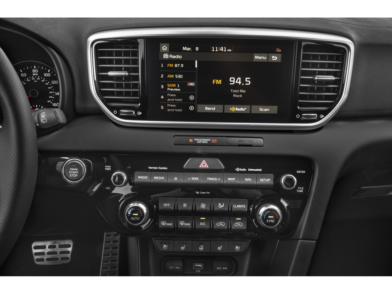 - Radio: AM/FM/MP3 Premium Audio System -inc: 320 Watts, 8" touchscreen, UVO link, navigation, harman/kardon sound system, 8 speakers including subwoofer and tweeters, Clari-Fi digital audio restoration, SiriusXM satellite radio, additional USB port, Bluetooth wireless technology, voice control, Android Auto and Apple CarPlay
